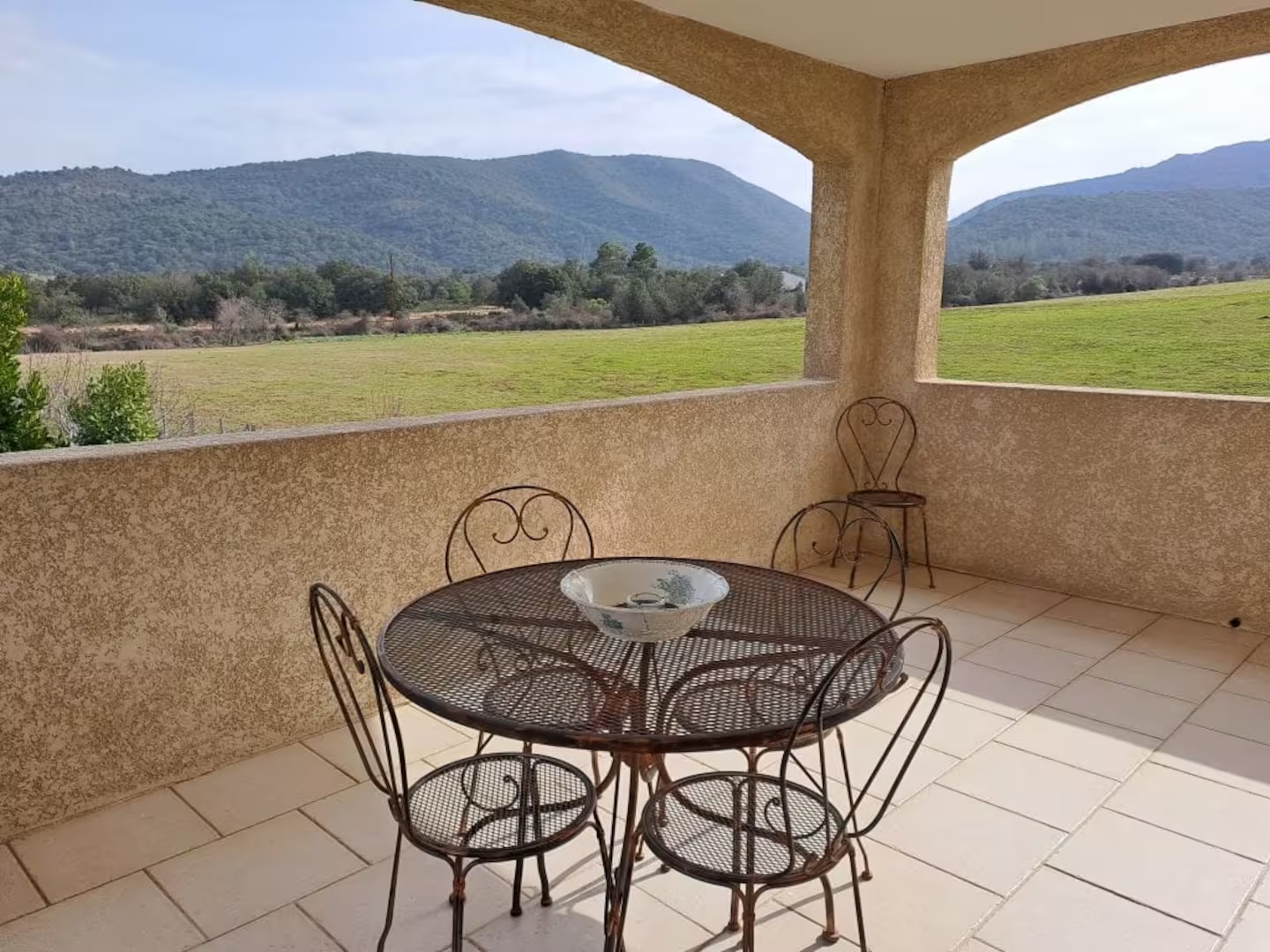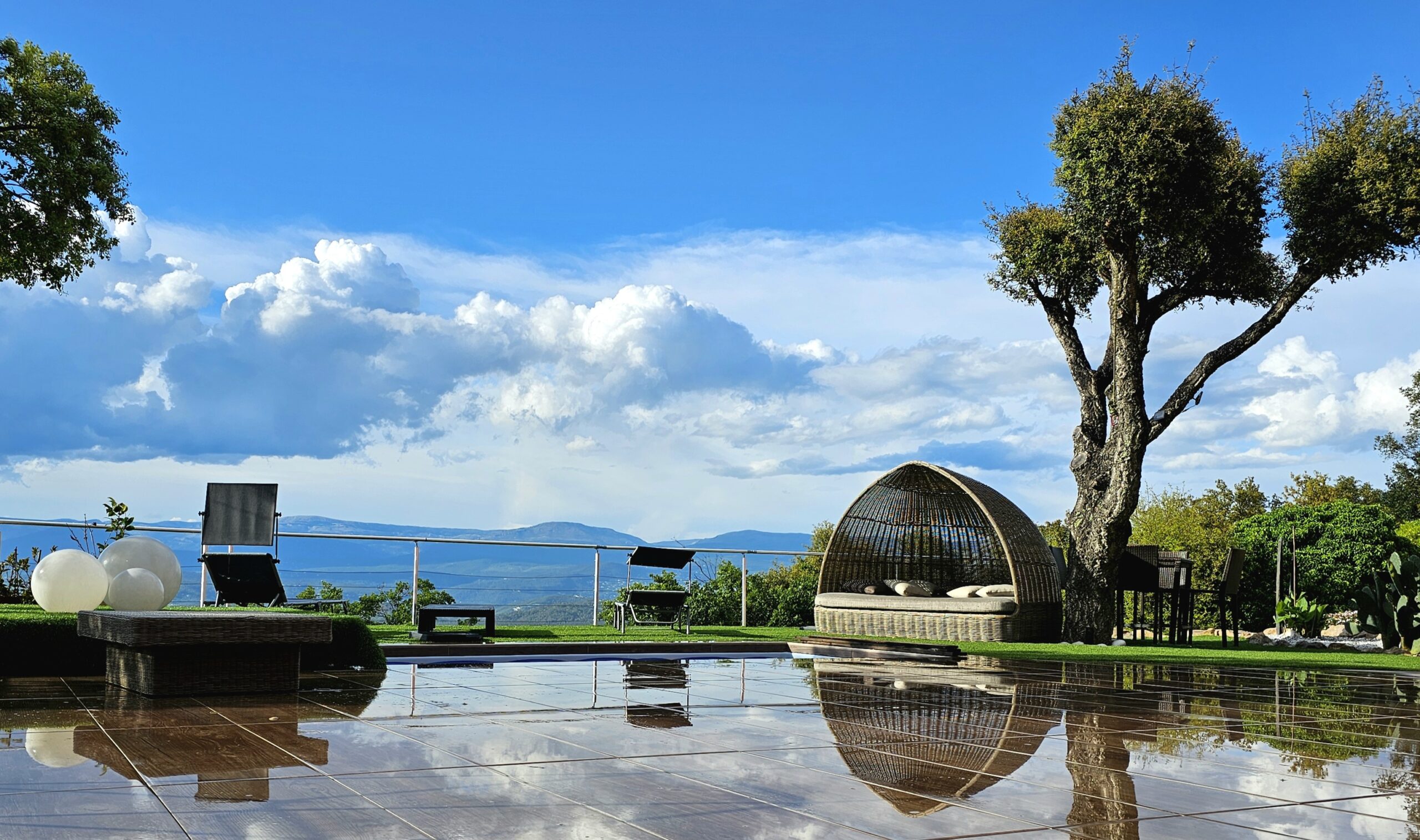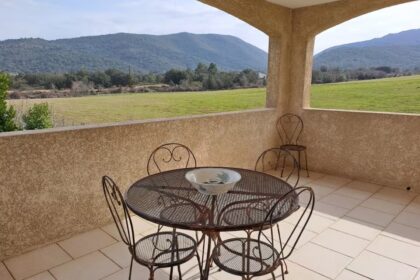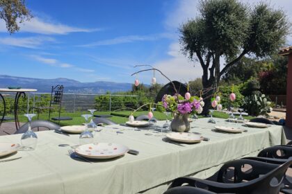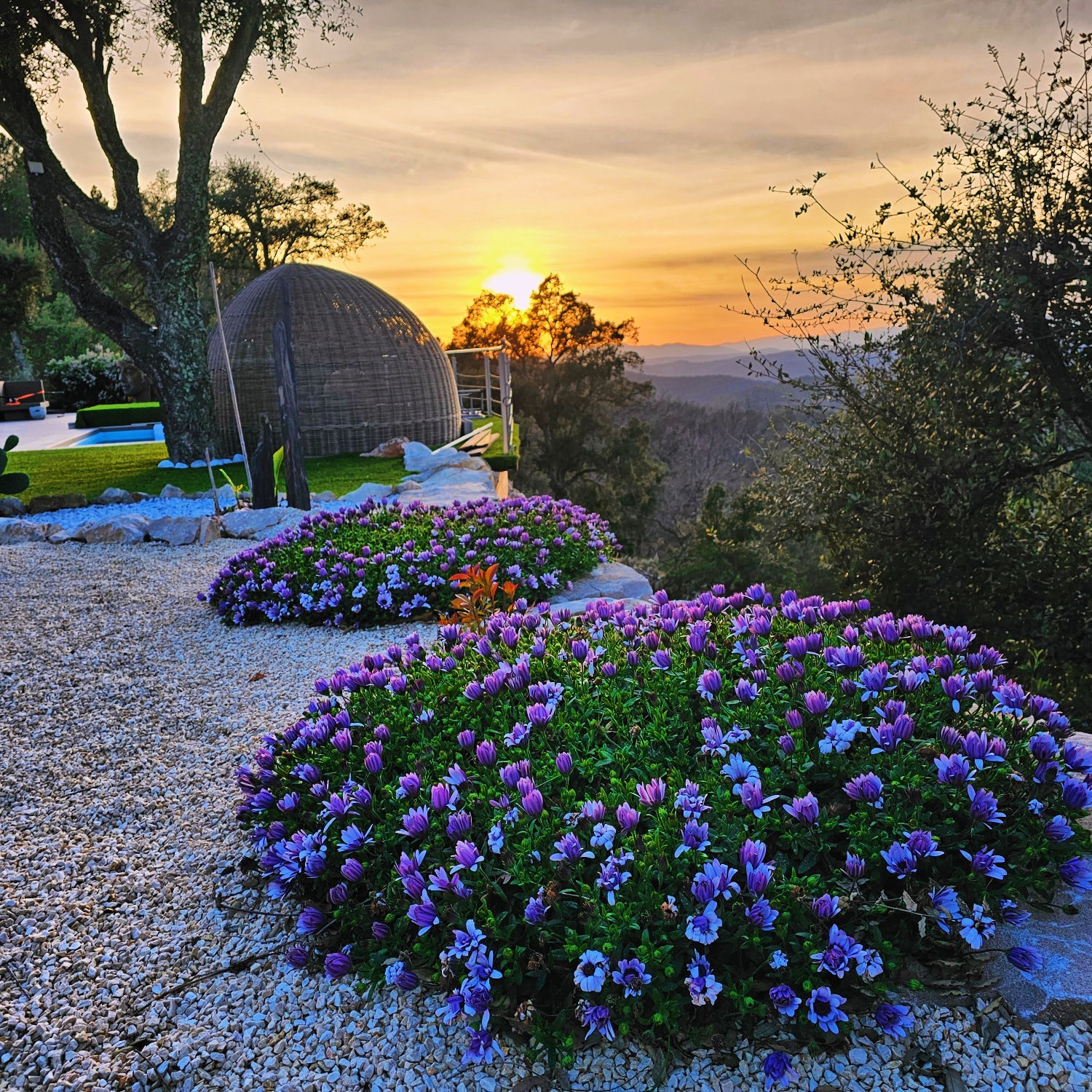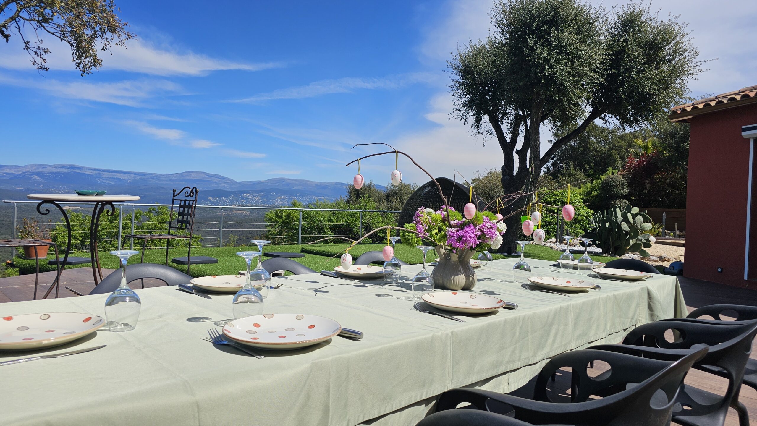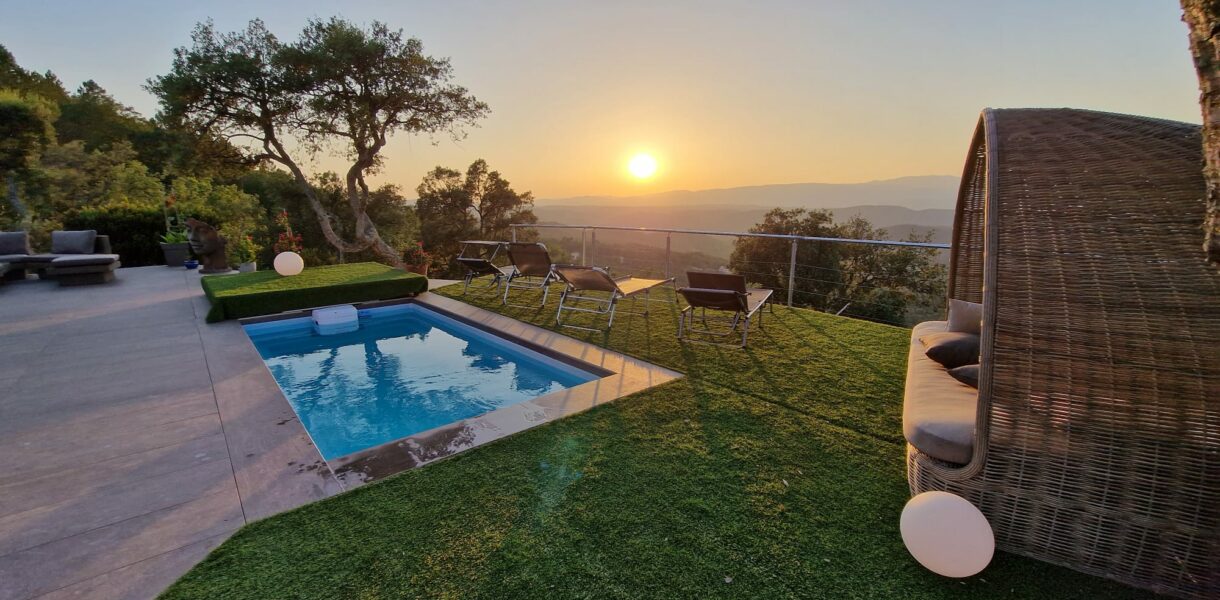 terrasse avec vue à 180° sur montagnes et coucher de soleil.
