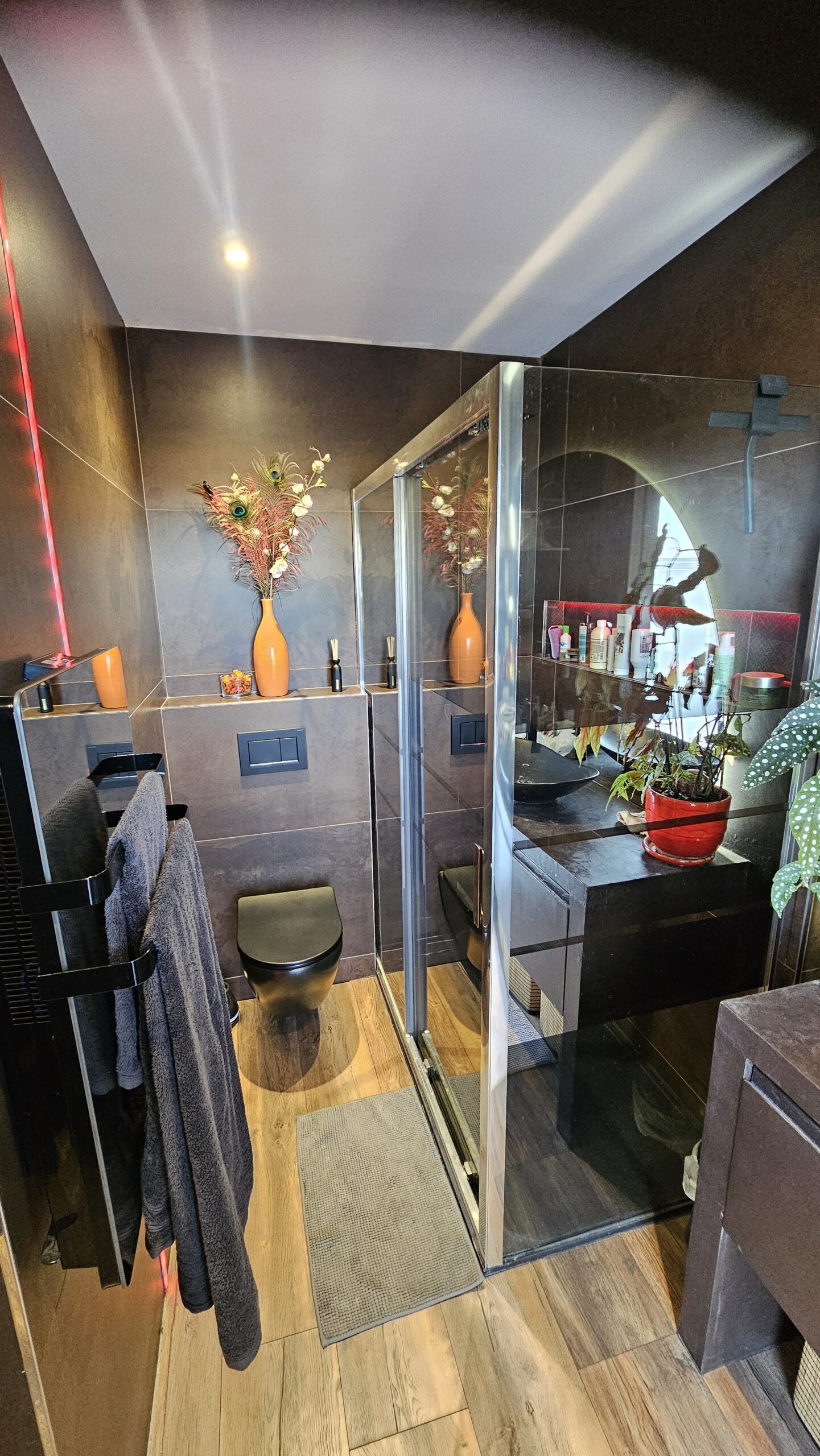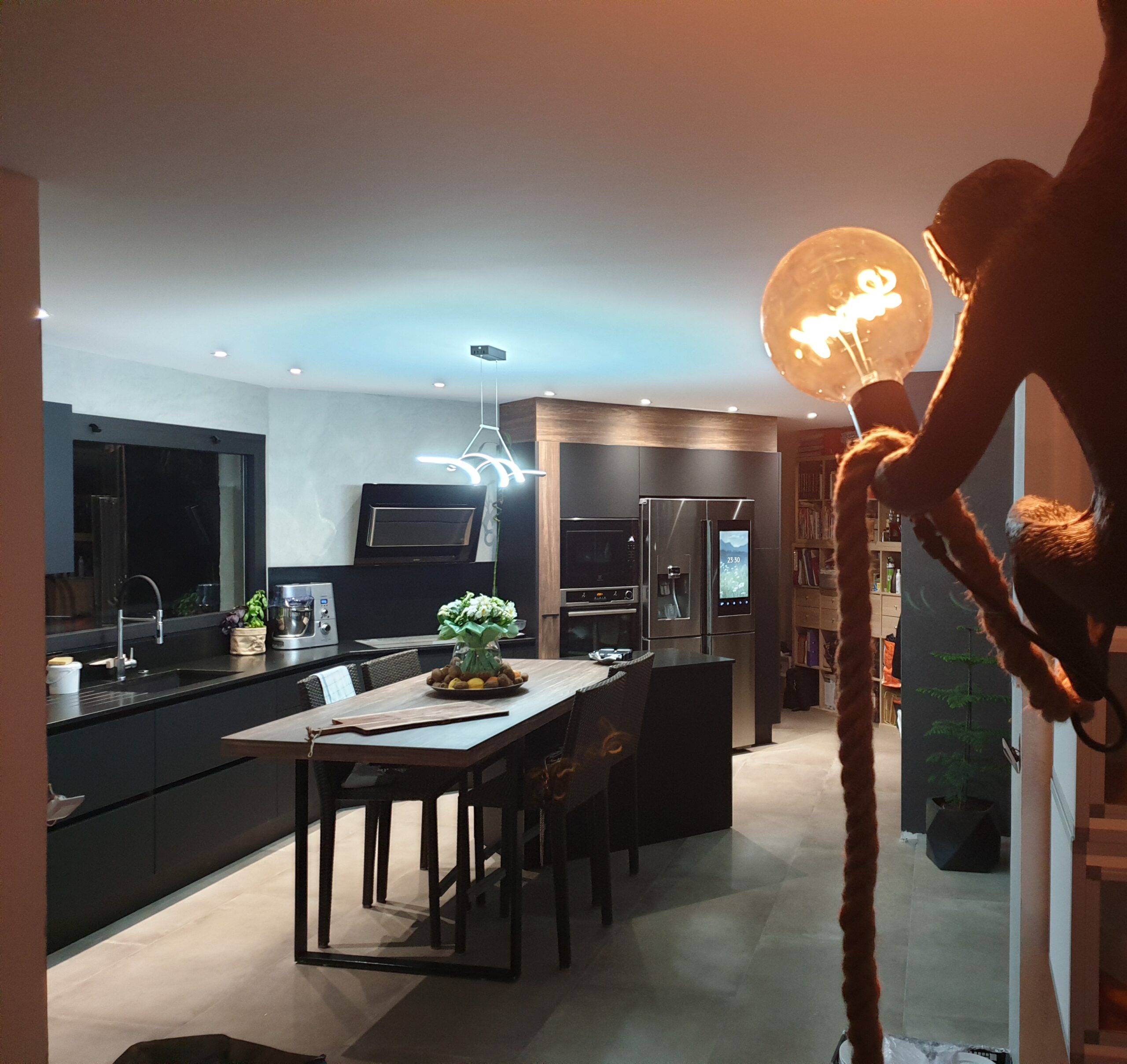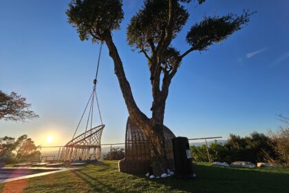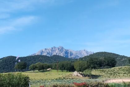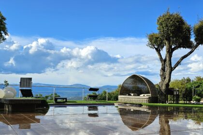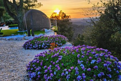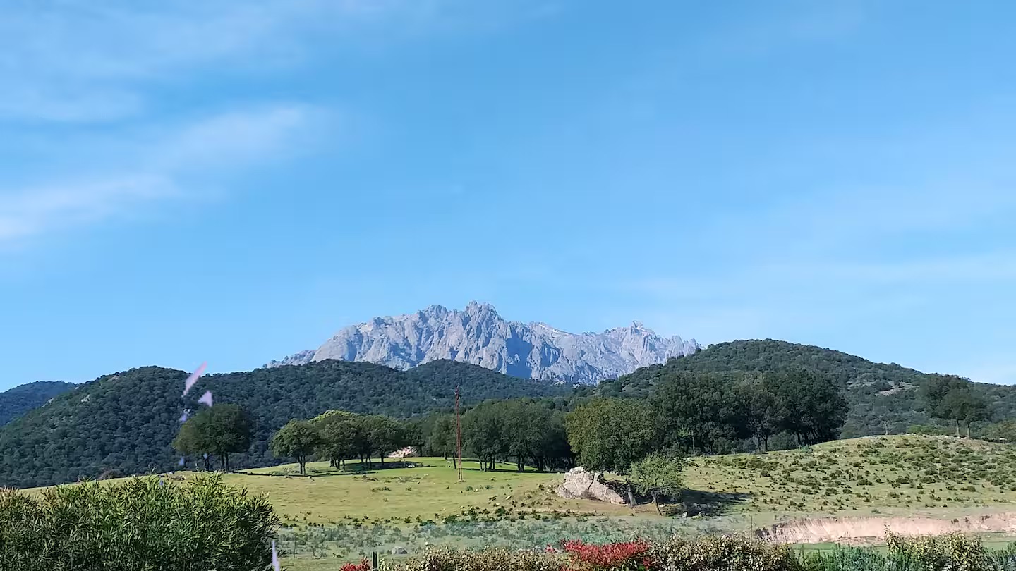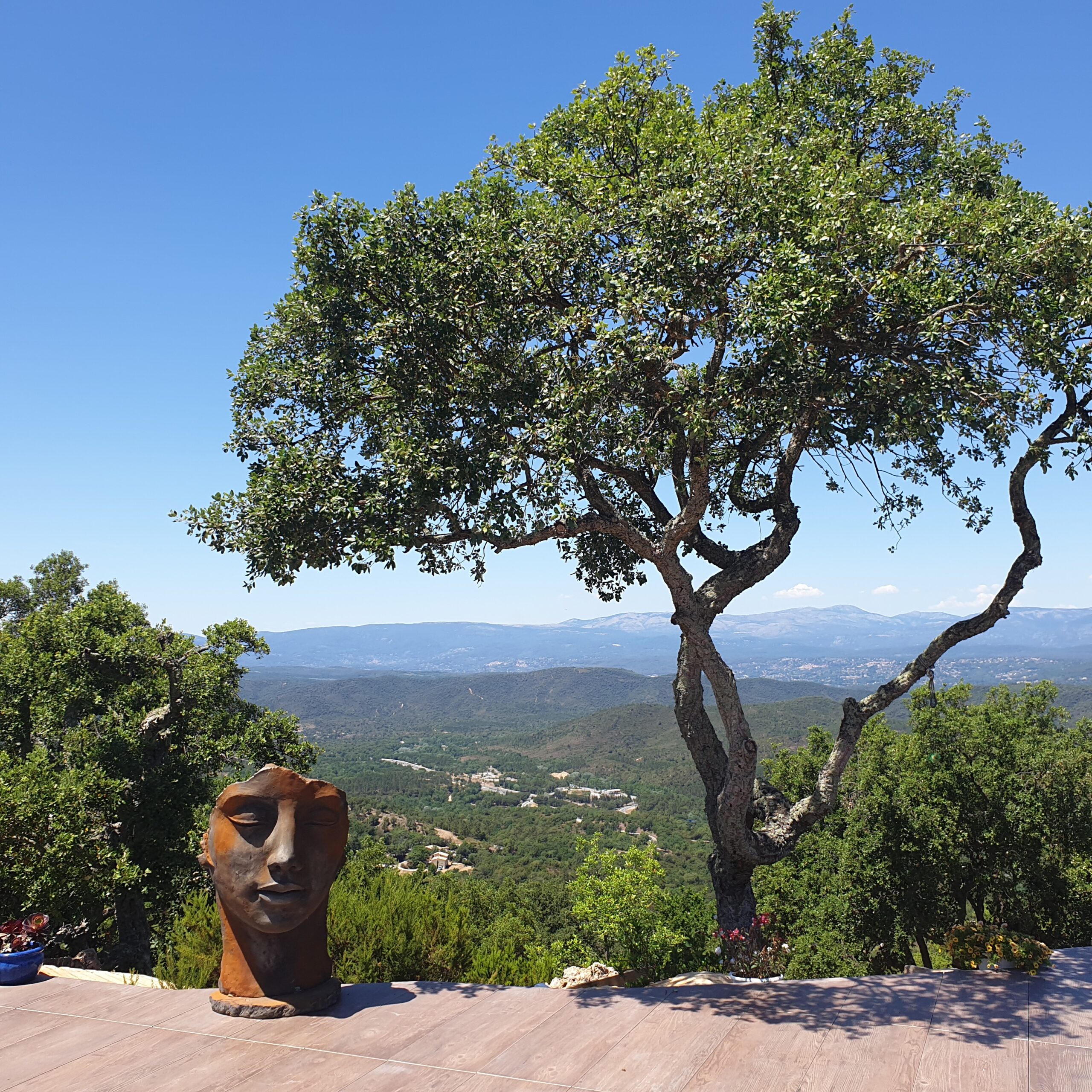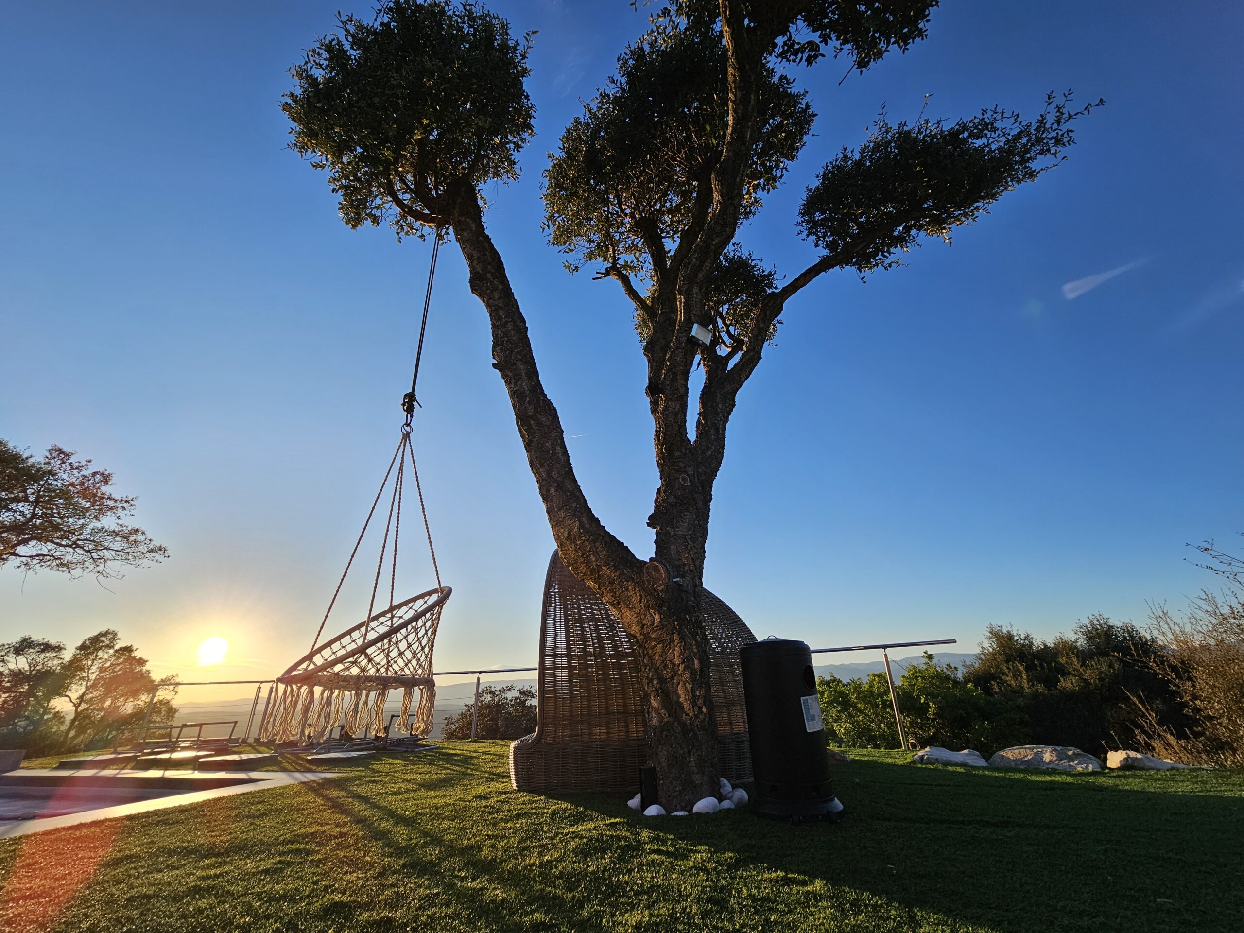 terrasse avec vue à 180° sur montagnes et coucher de soleil.